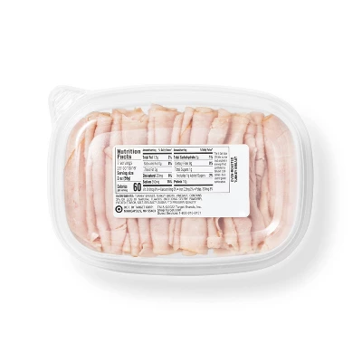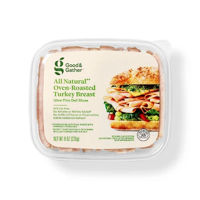 Craft delicious sandwiches, savory wraps and other go-to family favorites with this All Natural Oven-Roasted Turkey Breast from Good & Gather™. This turkey comes in ultra-thin deli slices that are delicious for enjoying with your favorite cheese, condiments and veggies, whether you place it between slices of bread, roll it up in a tortilla, or enjoy on salads and more. This turkey deli meat is 97% fat free, is minimally processed with no artificial flavors or preservatives,* and has no nitrates or nitrites added except those naturally occurring in celery powder and sea salt.
